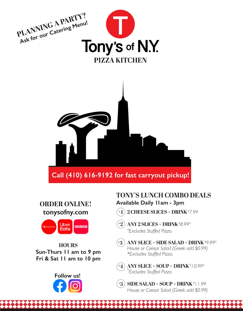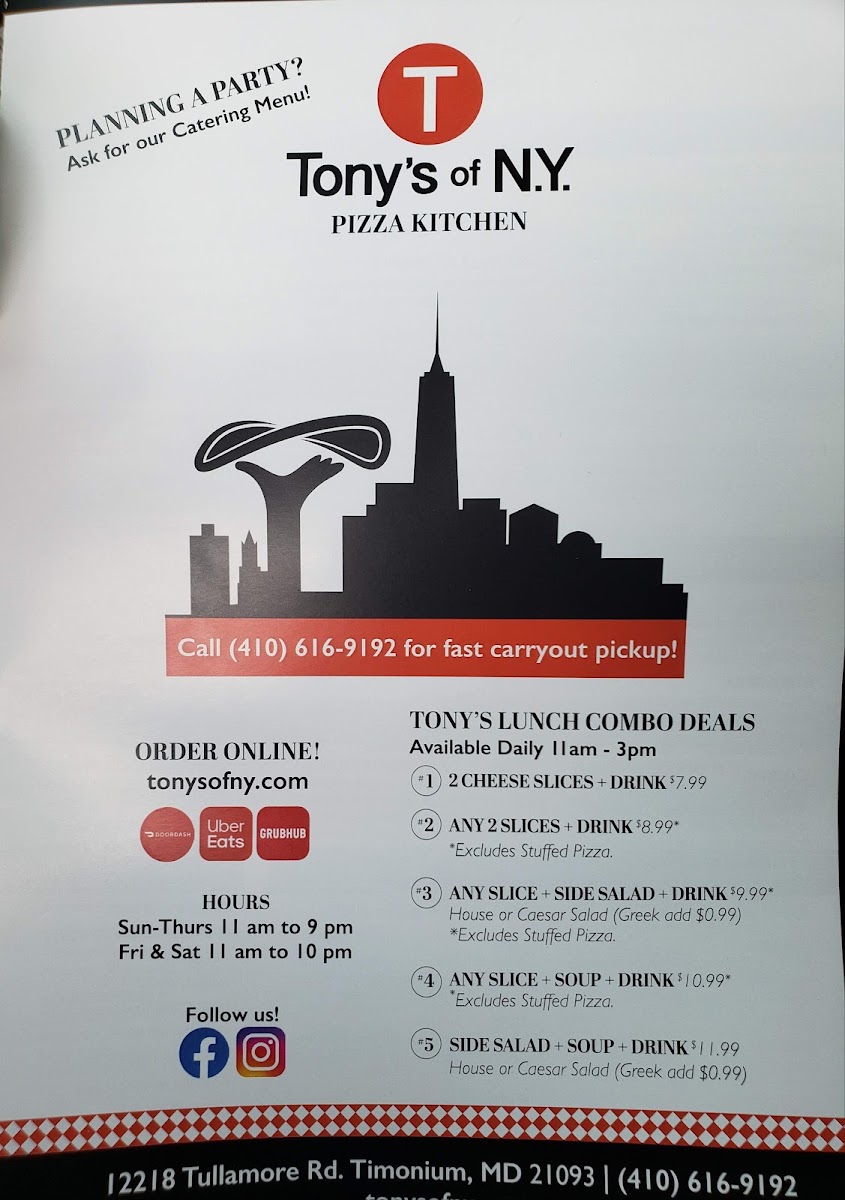 Introducing the menu at Tony’s of NY, a delightful eatery nestled in Timonium, MD. Known for its remarkable offerings, this restaurant delivers a true taste of New York with a focus on quality and flavor. Begin with refreshing beverages, from classic fountain drinks to energizing Red Bulls, perfect for washing down your meal.